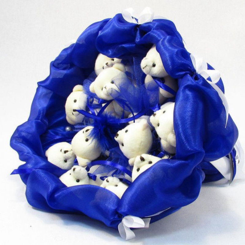 Букет з м'яких іграшок, 11 плюшевих ведмежат синій